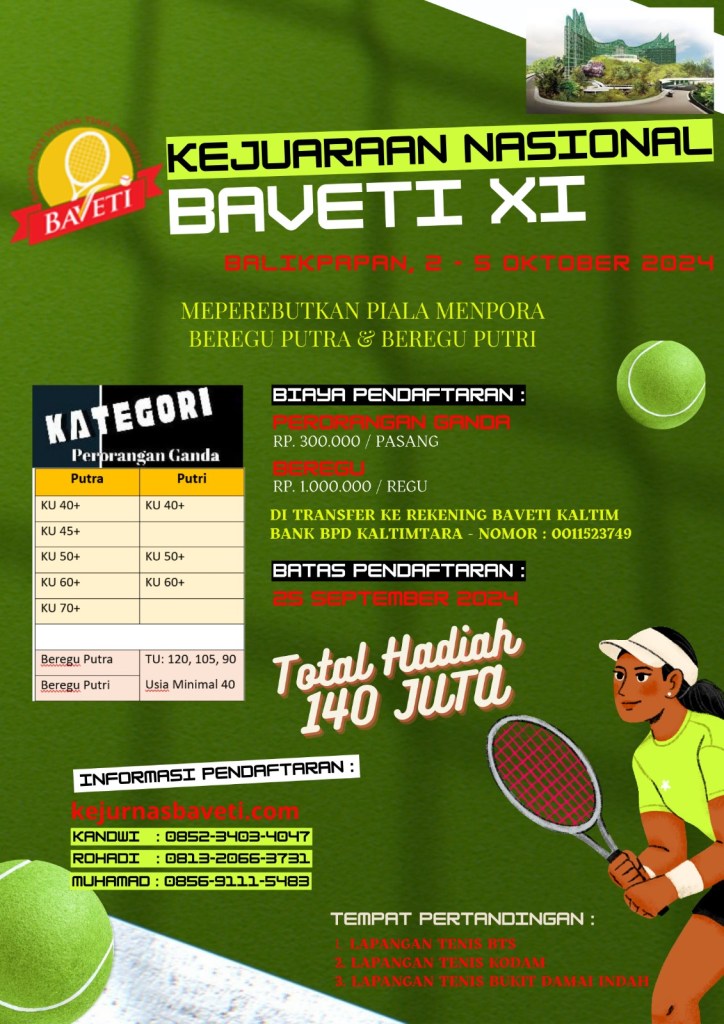 Kejuaraan Nasional BAVETI XI/2024 akan mempertandingakan Ganda Putra dan Ganda Putri dari seluruh Indonesia, dan juga Beregu Putra dan Beregu Putri yang akan memperebutkan Piala Bergilir MENPORA